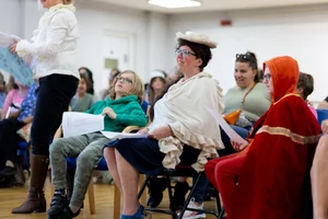 We kicked off activities with a drama workshop from practitioner Kate Perry, who led an enthusiastic crew of attendees through Shakespearean rehearsal techniques that he would have used with the King's Men (the name of Shakespeare’s acting company) to produce a scene from one of his plays.
