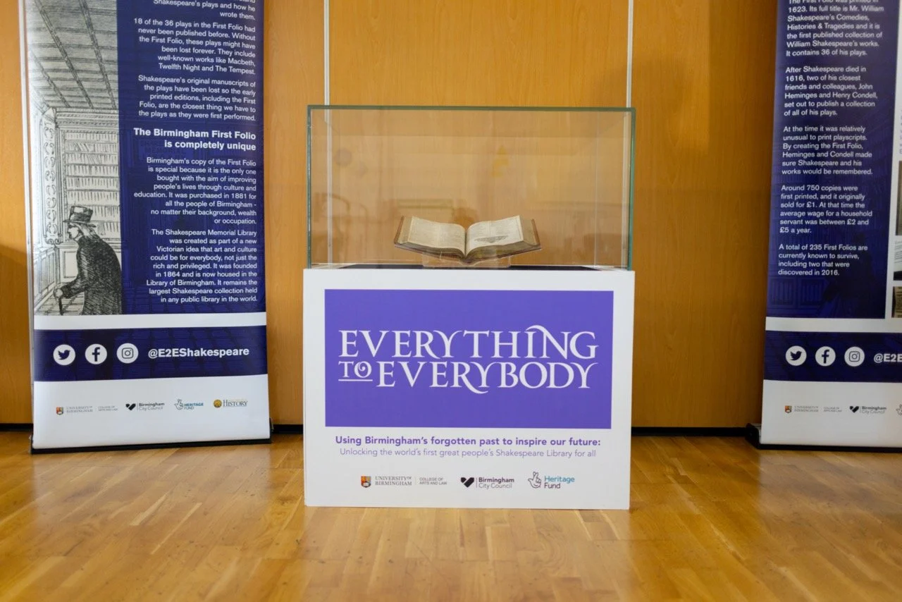 The folio was unloaded by a specialist team from the Library of Birmingham, under cover to prevent the daylight damaging the 400-year old pages. Once inside the cover was removed and the glass viewing case made a home for itself in the small hall at the Dorothy Parkes Centre for the day. Through the glass visitors could read extracts from Twelfth Night and spot the Library of Birmingham stamp in the bottom left hand corner, marking the folio as property of all of the people of Birmingham not just the wealthy few.